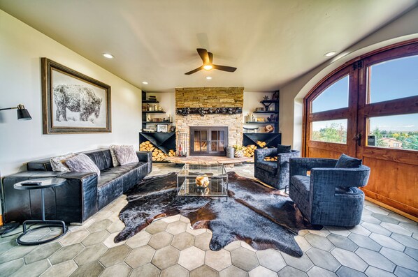 - Downstairs, enjoy a stylish bar and library with a fireplace, cocktail setup, and plush seating.
