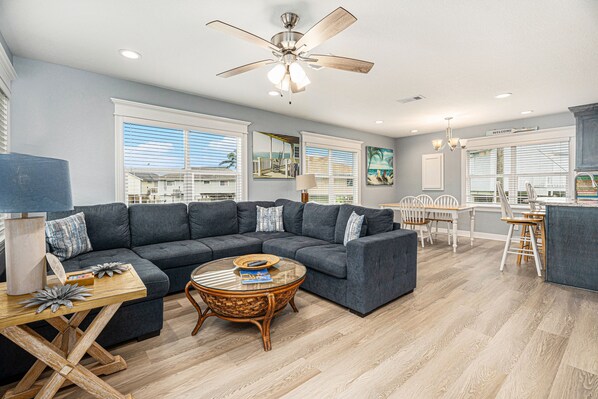 Bright and spacious, the main living area beckons you to come sink into the soft blue couches after a long day on the beach. Check out what's on cable or make some small bites to enjoy later on when you watch your favorite DVD on the flatscreen TV.