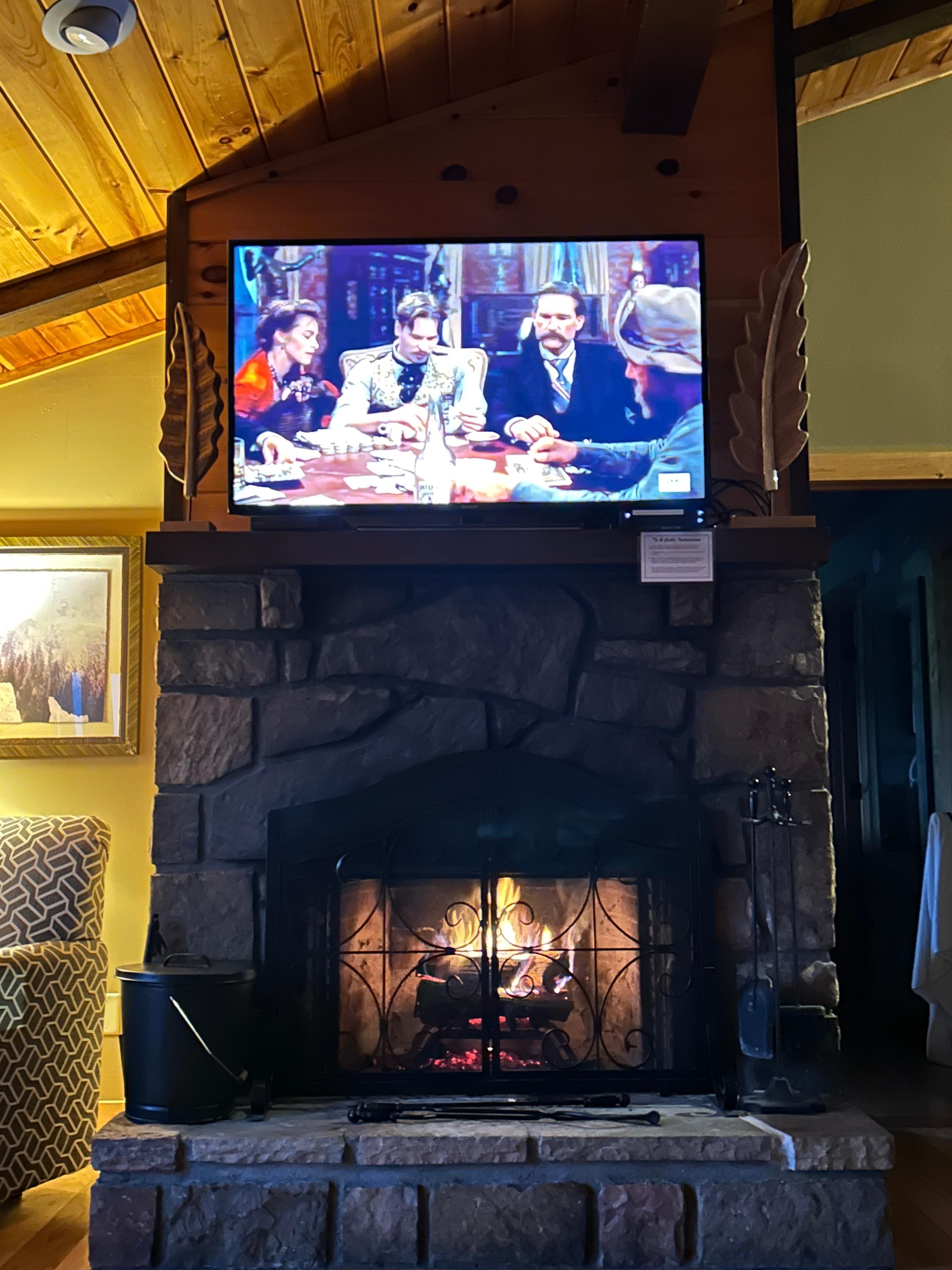Televisie, een open haard, een dvd-speler en tafelvoetbal