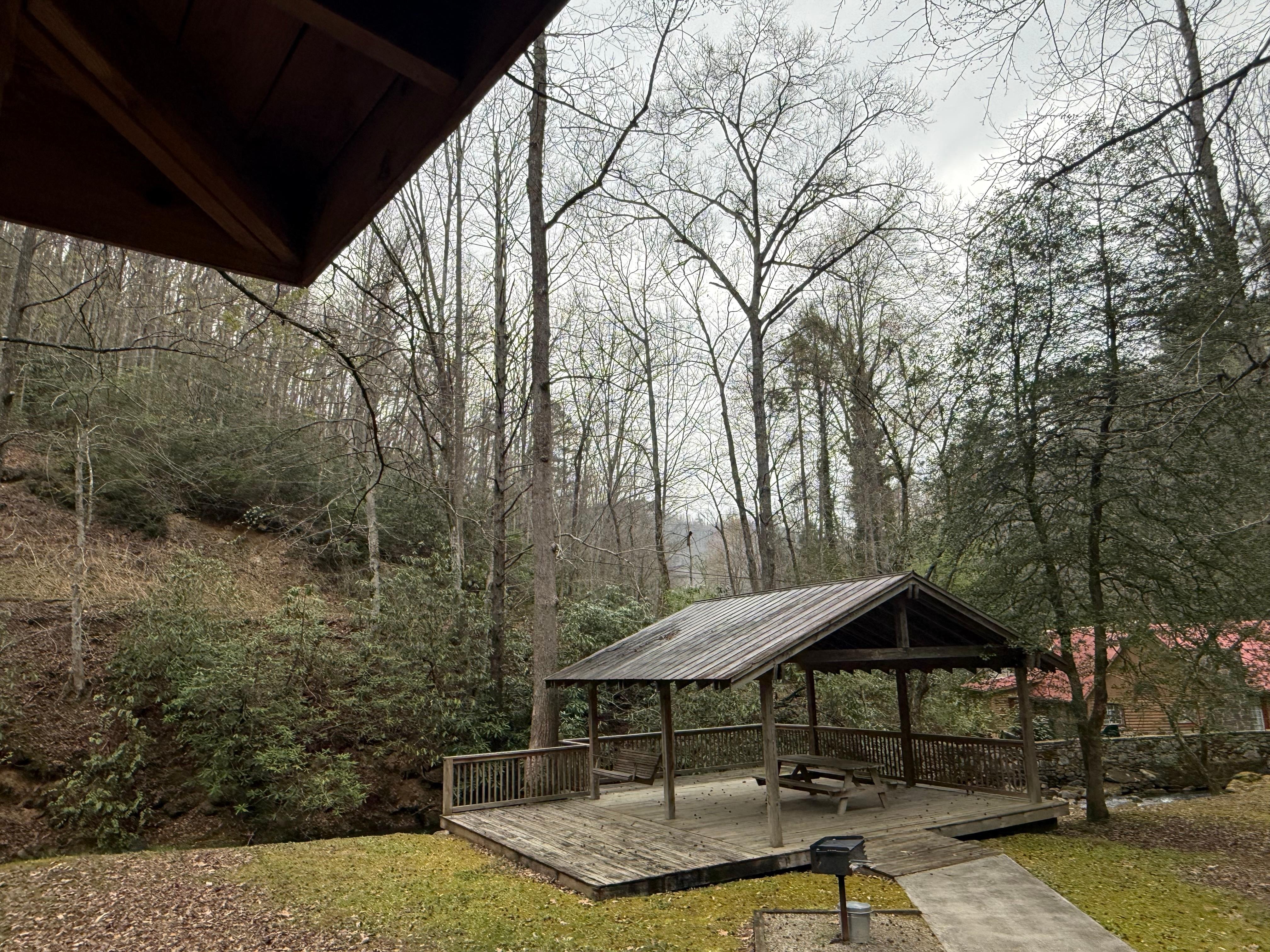 •Creekside pavilion with picnic tables and porch swing for outdoor gatherings.