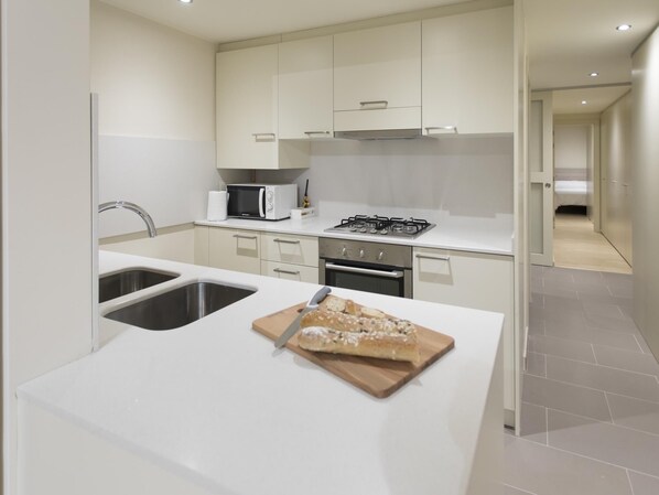 Een koelkast, een microgolfoven, een oven, een vaatwasser