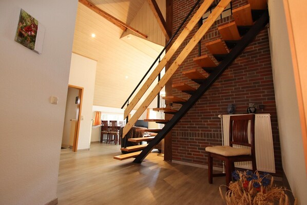 Bright and friendly furnished terraced houses on a 1,000 square meter plot. There are paddocks right outside your front door, so that you can not only observe the beautiful animals every day, but also ride them free of charge if you feel like it. Feeding the chickens, fetching eggs, stroking rabbits, playing with the cats, walking the dog Anna, riding Schetties and Haflingers... there is still real country life here. Strackholt is part of the East Frisian municipality of Großefehn and is about 20 kilometers south of Aurich. A tip: Take a bike tour through the Fehntjerland and cycle past the historic windmills, which are not only beautiful to look at, but are also the symbol of this region.