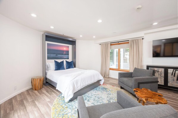 Beautiful, spacious, everything we needed. Great location for long walks along the ocean and short drive to beaches, restaurants. Didn't realize from listing, but there is a murphy bed (Q size?) on the lower level as well as a Q size bed upstairs in the loft. Beautifully furnished. Will return for a longer stay.