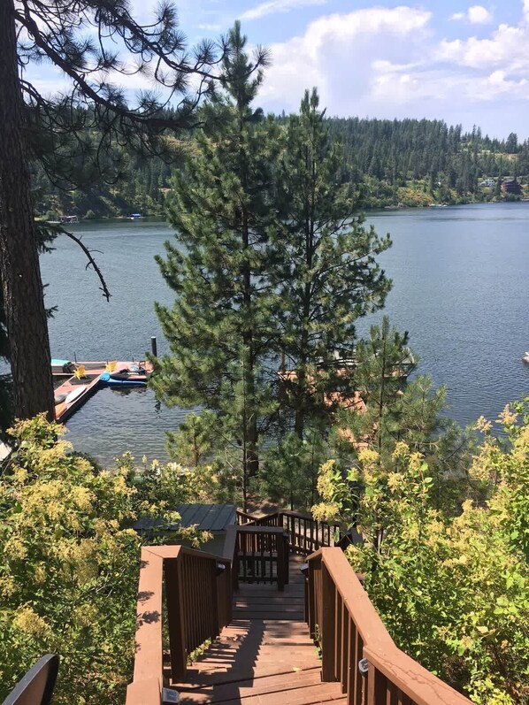 Une maison confortable de 3 chambres avec 69 pieds au bord du lac sur la paisible Neachen Bay du lac Coeur d'Alene (anciennement Squaw Bay). Regardez les magnifiques couchers de soleil du nord-ouest du Pacifique depuis la grande terrasse, la plage ou le quai privé! Le quai a une cale de bateau couverte et l'eau dans la baie de Neachen est toujours propre à cause du sol en pierre et en gravier. Des chaussures d'eau sont recommandées. La maison est facilement accessible le long du magnifique lac panoramique de Coeur d'Alene, et à seulement 20 minutes de l'action au centre-ville de Coeur d'Alene. NOTE IMPORTANTE: Il y a 65 marches menant à la maison, alors assurez-vous que tous les invités sont adaptés à la longue montée. Il y a 3 chambres et 2 salles de bain complètes. L'étage comprend 2 chambres (1 mezzanine + 1 chambre fermée). Une chambre a un lit queen et un placard et l'autre chambre (mezzanine) a 1 lit double, 1 lit double et un placard. Au rez-de-chaussée se trouve une autre chambre avec un lit king-size et un dressing. Le rez-de-chaussée offre deux espaces de vie avec plusieurs canapés - un qui se transforme en lit double. La maison est entièrement meublée et dispose de vaisselle, de draps, de draps, de serviettes et de tout le nécessaire pour de bonnes vacances - il suffit d'apporter votre propre nourriture et boisson!