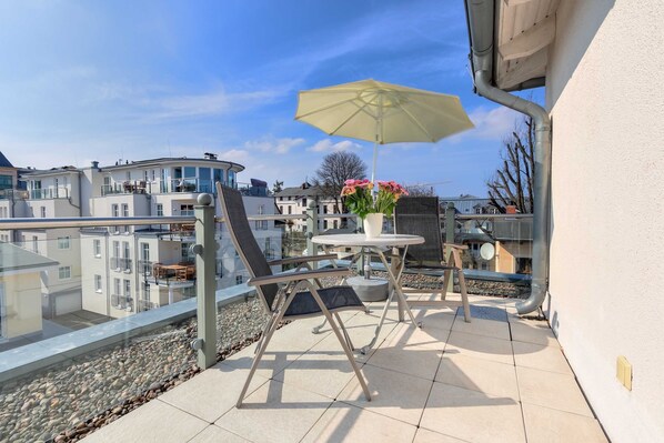 Villa Aquamarina Whg. 26b, TERRACE, ELEVATOR: Nice 1-room apartment with modern, good facilities. Combined living room / bedroom, separate kitchen with dining area, shower room, roof terrace to the south with sun until evening. The apartment has a parking space. From the Villa Aquamarina it is the center and the pier about 3 minutes walk. The beach is 50 m. The apartments of the Villa Aquamarina all have password-protected WLAN (equipment-bound, Euro 1,50 per day and per unit).