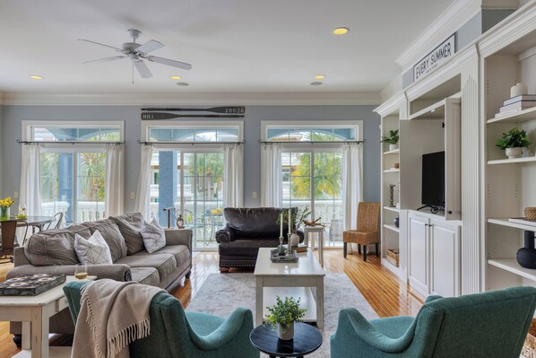 Inside, large windows and lots of natural light illuminate beautiful hardwood floors and tasteful decor, creating a warm and welcoming atmosphere. The open layout is great for connecting with a group, whether you're in the kitchen, making your way to the balcony, or enjoying a movie night on the living room's flatscreen TV. Thoughtful touches like a wine fridge and a mini fridge make it easy to feel right at home.