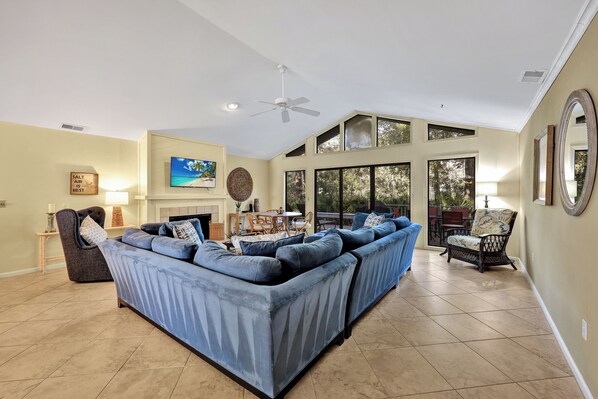 This four bedroom, four bath home is located about 100 yards from the beach and has a quiet, natural lagoon view. Minutes to the central hub of Palmetto Dunes Oceanfront Resort - tennis, biking, shops, bikes, restaurants, golf, fishing and more! It is a great spot to experience Island life and see the vast array of wildlife. When you enter the home, you are greeted with bright décor and natural light. The living room has a mounted flat screen television to relax after a long island day.