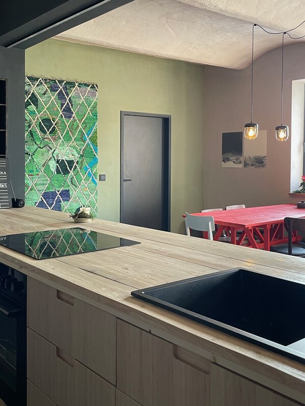 Vaisselle pour 6 personnes - ustensiles de cuisine et de pâtisserie - cuisinière électrique et four - réfrigérateur avec compartiment congélateur - lave-vaisselle - Frenchpress & espresso pot - bouilloire