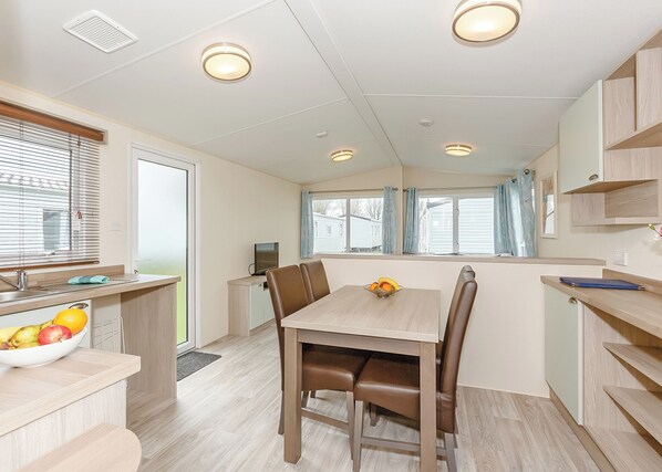 This luxury 12ft-wide caravan is ideal for exploring the surrounding area, featuring two tasteful bedrooms, one double and one twin along with a modern family shower room. Spacious, open-plan living area is light and airy, with comfortable sofas, dining area and well-equipped kitchen. Pets allowed in selected accommodation only.