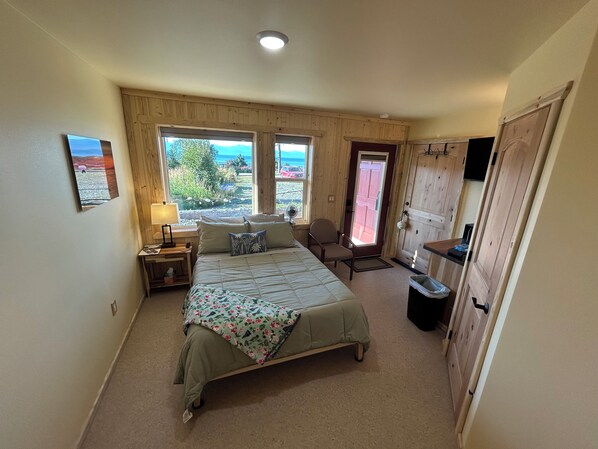 Stay comfortably in Homer with beach access and our STUNNING view. The soothing ambiance of this cozy space is perfect for guests looking to unwind after a day of exploring. This lovely space is designed with access to the ADA BEACH SUITE to enable travel with a caregiver, or more needed sleeping space. The Sandpiper has a DOUBLE BED and private bath and kitchenette. It may be rent alone or in conjunction with the Beach Suite using the adjoining door.