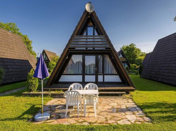 3-room house 50 m2 on 2 levels, on the ground floor. With sloping ceilings: living/dining room with satellite TV and radio. Exit to the garden, to the terrace. With sloping ceilings, open kitchen (2 hot plates, electric coffee machine). Shower/WC. Top floor: (steep stair), 2 rooms with sloping ceilings, each room with 2 beds. Electric heating. Terrace furniture. Facilities: Internet (WiFi, free). Please note: non-smoking house. Maximum 1 small pet/ dog allowed. A-frame house in wood construction.