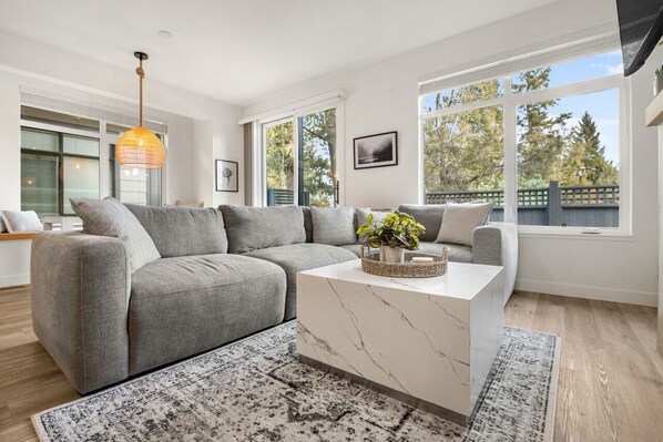 Surrounded by views of the Purcell mountains and lush greenery, the common room is graced with large windows to enjoy the views and let in plenty of natural light. When the wintery nights land, enjoy the cozy vibes of the gas-lit fireplace while catching up on your latest episodes on the large Smart TV.