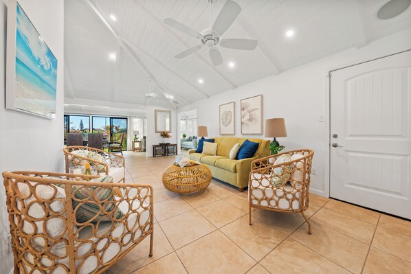 -Ceiling fans and louvered windows throughout for optimal trade wind airflow