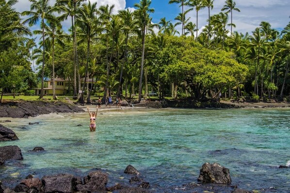 Casa by the Sea Welcomes you! Relax in Paradise with 1 acre of Tropical Jungle to explore and the sounds of the Ocean,Birds & Frogs. 5 Min short walk to Paradise Cliffs & Parks. COME SEE THE ONLY HAWAIIAN ISLAND WITH AN ACTIVE VOLCANO. 15 min Drive to Mackenzie State Park. Park and Hike to POHOIKI NEW BLACK SAND BEACH. 30 MINUTES TO VOLCANO NAT Park, Waterfalls, BLACK SAND BEACHES AND CAVES. WE ARE CENTRALLY LOCATED AND NOT OFF THE GRID. WIFI, TV, HOT WATER, AND ELECTRICITY ALL PROVIDED.
