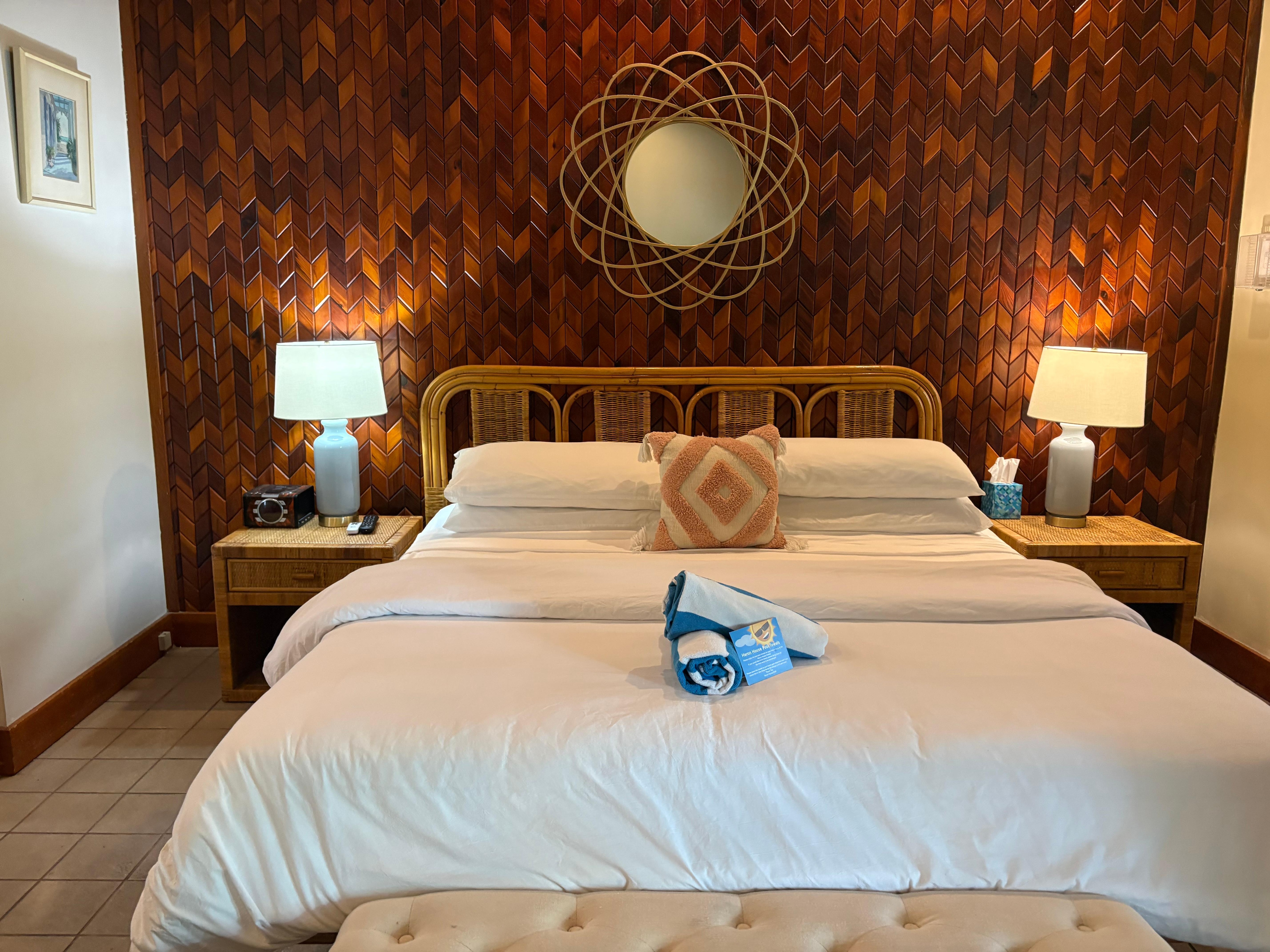 When we got to the heron house and got to our room it was clean. During our stay the only thing that was done we were given clean towels. Our floor was not swept or mopped. The staff when we arrived on a Wednesday was wonderful. He was accommodating and very pleasant. Now on Friday the gentleman that was on during the day was a little rude. I asked about happy hour and he said oh he forgot and he was leaving. Saturday was only a pitcher of as he put it cheap sangria. Not impressed. The outdoor pool was very nice. We weren’t concerned with parking as we had no car. All in all the heron house is just ok for the money they charge.