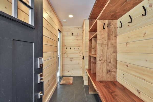 GEAR STAYS ORGANIZED AND OUT OF THE WAY. The dedicated entryway features custom floor to ceiling shelving and bench seating built for mountain athletes. It keeps your boots, helmets, and boards in one place, so you spend less time searching for gear and more time on the trails. It is a practical solution that keeps the main living area open and clutter-free for your group.