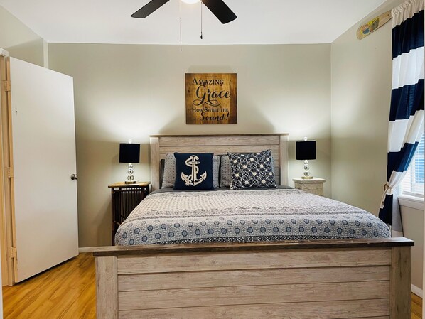 This beautiful lake house accommodates 8 people in 3 bedrooms. The master bedroom is fitted with a queen bed. Bedroom 2 has a set of bunk beds with full sized mattresses. Bedroom 3 has two twin size beds. Each bedroom has extra sheets in the closets, just in case you need them. There are also fans in each closet, so you don't need to bring a fan with you. There are extra blankets in the master closet.