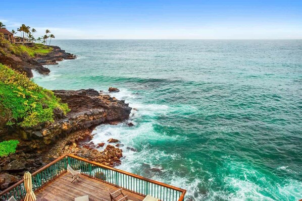 This place is amazing. It is in a great location. Perfect for taking walks. Poipu beach is just minutes away. There is a hiking trail that takes you to caves and a hidden beach. It comes with a private deck that is shared with the condo next door. No need to schedule a whale watching tour. You can watch whales breach all day long. The deck overhangs the water below. There are turtles, fish, crabs, all kinds of sea life that is easily visible. Don’t waste your time looking for other places to stay. This place is perfect.