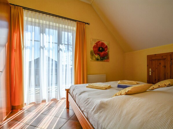 You live in a 54 m² large 3-room apartment with balcony on the top floor. The captured areas such as kitchen and bathroom have electrically openable skylights. Consequently, the apartment is flooded with light and well ventilated. For this purpose, the high ceilings contribute (3.25 m). Here it is meant that the sun shines, even when it's raining outside. The spacious living room is equipped with sofa bed and two armchairs, a dining area with chairs, TV, stereo and DVD player. The kitchenette with refrigerator, dishwasher, oven u. Stove, microwave, coffee maker, toaster, kettle, etc. located outside the living area in the upstream entrance. A room with double bed, a bedroom with 2 single beds (these can be put together as a double bed) and the floor-heated bathroom with shower, toilet and towel radiator complete the picture of this apartment. For small children is ready a highchair. Per person is a linen package as initial equipment available. An underground parking space (access height 1.95 m). From the underground car park you can easily reach the apartment via a lift. Free Wi-Fi is available throughout the apartment. Sauna, washing machine and dryer for a fee in the house.