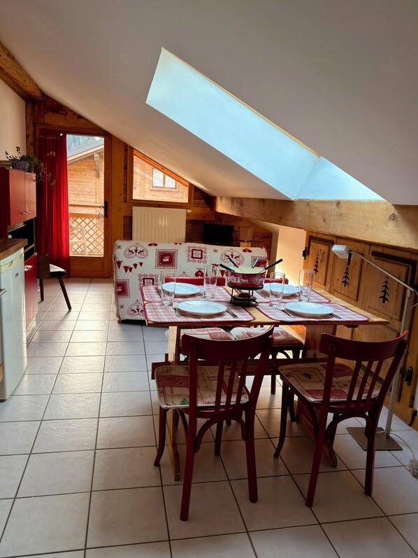 L’espace de vie offre une cuisine entièrement équipée (y compris appareil à raclette et fondue), une table repas sous un velux avec vue est sur le Mont-Chauffé, ainsi qu’un coin salon avec canapé et télévision.