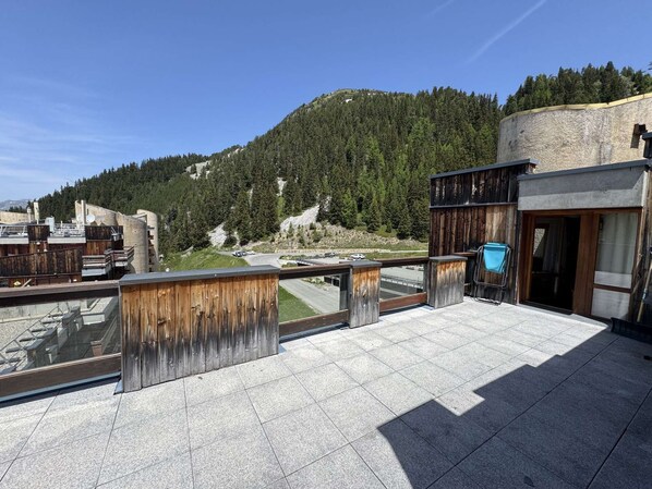 The highlight of the apartment is its large terrace, a rare feature in Bellecôte, offering an almost panoramic mountain view — perfect for enjoying your morning coffee or a quiet moment in the fresh Alpine air.