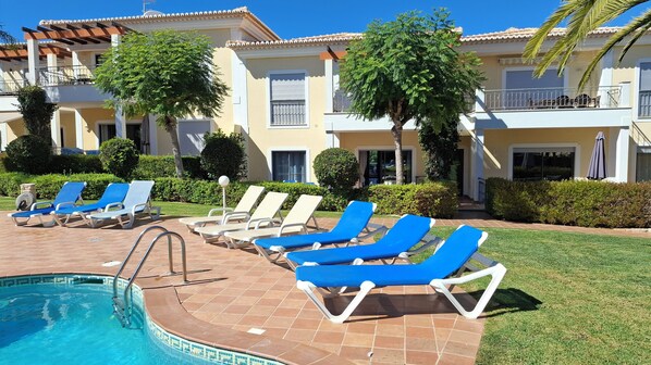 The large terrace has a large dining table with 6 chairs which is perfect for outside dining, 6 sunbeds and direct access to the pool and resort garden via a private gate.