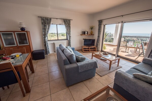 The best panoramic sea views in the area can be enjoyed from the large terrace of this top floor two bedroom apartment situated close to the beach of Meia Praia.