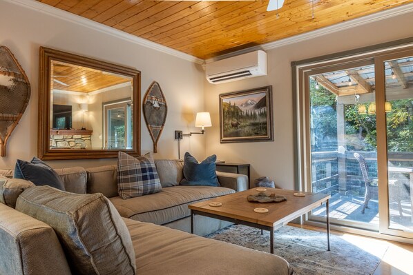 The updated kitchen and open living room are perfect for gathering with friends and family. Enjoy the gas fireplace in the cooler months or open the sliding doors to the deck and relax to the sound of the stream in the spring and summer. The cozy main bedroom has a large walk-in closet and direct deck access. Downstairs there are two more guest rooms with a queen size bed and a full size. The downstairs living room is perfect for game or movie nights.