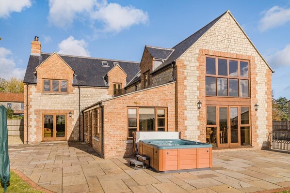 A large driveway to the left of the house offers ample off-road parking and leads to the large rear garden, with gas BBQ, garden furniture, private hot tub with lawn and patio.