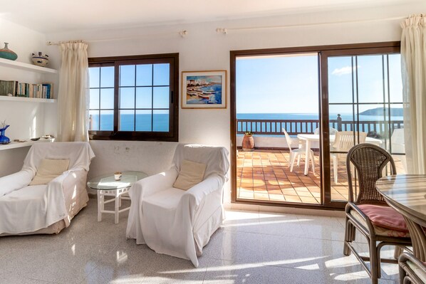 Die Wohnung war genauso wie in der Anzeige beschrieben. Alles nötige war vorhanden, um einen entspannten Urlaub dort zu verbringen (wie beschrieben, war sogar eine kleine Grundausstattung für die ersten Tage mit einem kleinen Lappen, Toilettenpapier, Spültabs und Waschmaschinentab ebenso vorhanden wie Bettwäsche und Handtücher). Die Wohnung ist im dritten Stockwerk eines Hauses mit mehreren Wohneinheiten und über eine Treppe zu erreichen. Sie teilt sich den Pool mit den anderen Wohnungen des Hauses und dem Nebenhaus des Grundstücks - wir hatten ihn jedoch meistens für uns allein. Das Haus und der Garten waren sehr gepflegt. Der Pool wurde regelmäßig sauber gehalten. Die Wohnlage ist sehr ruhig.Etwas abenteuerlich ist die Abfahrt zur Garage: Diese ist sehr steil und eng, aber kann auch mit einem größeren Auto (wir waren mit einem Touran da) genutzt werden.Check-in und Check-out waren problemlos und die Kommunikation sehr freundlich.Wir haben unseren Aufenthalt sehr genossen. Besonders die Abende auf der großen Terrasse mit dem Blick aufs Meer. Am frühen Morgen des letzten Tages, als das Meer ganz ruhig war, haben wir durchs Fernglas sogar Delfine sehen können.Wir können die Wohnung empfehlen und würden sie noch einmal buchen.