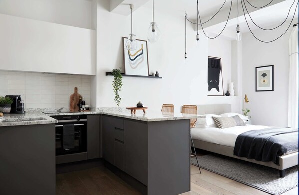 The kitchen is well equipped, suitable for cooking substantial meals and stocked at the start of your stay with basic essentials such as sugar, tea, coffee & granola. The studio is fitted with a flat-screen Smart TV and blackout blinds, however, please do bear in mind if you are a light sleeper there can inevitably be noise from the street when in London. The large bathroom is an En-suite with bath and shower and towels and premium soaps/shampoos are provided. Complementary WiFi is included throughout the building. The building is located on the main road so it is to note that there is street noise.