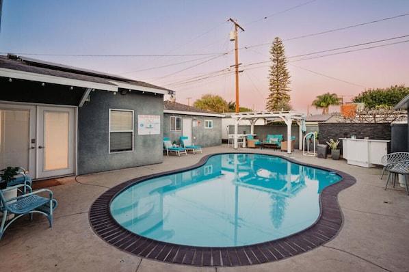 Relax in our newly renovated coastal-themed pool house near Long Beach Airport. This spacious home features a master suite with dual vanities, a soaking tub for two, and a waterfall shower with natural stone finishes. Lounge by the sparkling lagoon-style pool, perfect for family gatherings or friend reunions. Eco-friendly with Tesla-powered solar panels and ample parking, this home offers comfort, convenience, and a touch of luxury for your SoCal getaway.