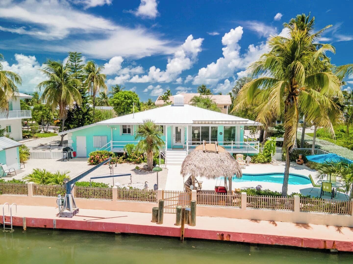 This gorgeous canal-front home boasts views of the water, a dock that can accommodate a 25-foot boat, and two private pools - one with a swim-up bar. The elegant decor and grand kitchen will make you never want to leave! The outdoor area of this home is large and great for gatherings, featuring a hammock, a firepit, a very large ice machine for fishing or margaritas, and an outdoor TV to catch the game from the pool. There is even a fish-cleaning station located on the dock!