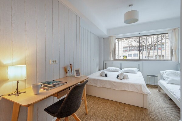 It has three welcoming bedrooms each equipped with a desk, including a first bedroom with a double bed of 160 x 200, a second bedroom with a double bed of 160 x 200 and a single bed of 60 x 120, as well as a third bedroom also equipped with a double bed of 160 x 200.
