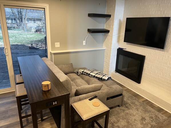 TV connectée, cheminée, jeux vidéo, livres