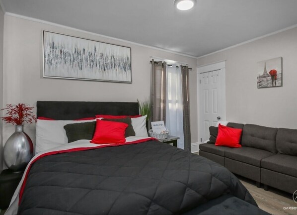 Kick back and relax in this calm, stylish, and comfortable one bedroom suite. This property is a unique newly updated 4plex building that houses 4 different separate units. The property has new fresh paint, new flooring, new appliances. new keyless locks, and WiFi access. Your unit will be comfortable and conveniently located to local restaurants, businesses, gas stations, grocery stores, and shops. Pick up or have food delivered to you or choose to stay inside to unwind with options to watch wifi streaming services or movies on the Roku television. Guests have complementary snacks and beverages (water and coffee). Guests will have the option of cooking your own meals and serving them with seasonings, Pots, pans, bowls, plates, cups, coffee Makers and Utensils are on site that are provided and stored in the kitchen cabinets for guests to use during their stay. Fresh towels, irons and tc are in closet next to the sofa. There is also room for the guests to sleep on the sofa bed.
