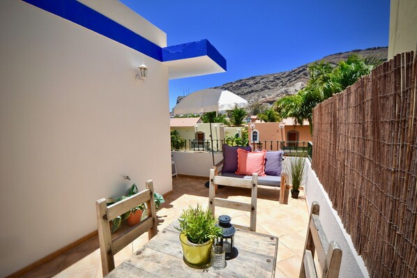 Die Terrasse ist sehr schön mit einem Blick auf die sehr grüne und gepflegte benachbarte Hotelanlage. Es gibt Sonne und Schatten, je nach Bedarf. Den kleinen Balkon am Schlafzimmer kann man auch sehr gut am Morgen nutzen. Die Küche ist mit allem ausgestattet, was man so braucht. Der Parkplatz ist direkt neben dem Eingang, super praktisch!