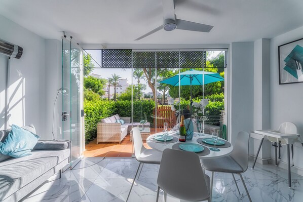 Beautiful Conservatory area with dining table and 4 chairs and glass curtains that can be fully opened, allowing you to benefit from the beautiful outdoor weather