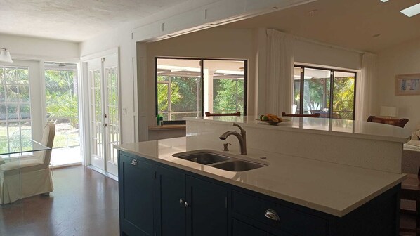 The house provides well laid out, open plan accommodation for up to 6 people. It boasts marble effect stained concrete flooring, low level lighting, four newly installed skylights in 9ft tunnels with accent lighting, custom built, hand painted shaker style kitchen imported form UK cabinet makers 'Yorkvale kitchens' with designer Pompeii quartz countertops, new high end stainless steel kitchen appliances, enormous 500.sq ft. master bedroom suite with Robb and Stucky furnishings, walk in closet, and remodeled bathroom, shower and toilet, large second bedroom with two single beds (can be joined to form a king bed), walk in closet, newly remodeled Jack and Jill bathroom with hand painted cabinetry from UK cabinet makers Yorkvale, cabinet to ceiling mirrors, new bath with shower. There is a sofa bed for additional guests. Outside and accessed from the living area is a newly laid 650sq. ft. travertine tiled patio and newly fitted Florida blue composite decking with inground accent lighting, outdoor bbq, quality patio furnishings and great views over the back yard. Accessed through a small path at the bottom of the yard is a private woodlands for sole use of "The Woodlands" residents with a gorgeous, secluded, private heated swimming pool. The pool is rarely used.