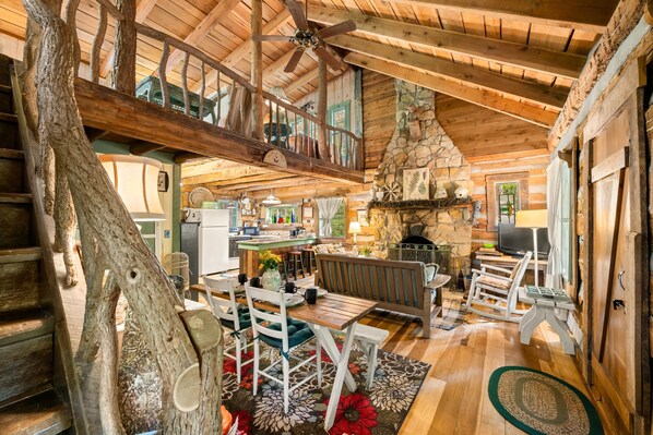 Cozy up in front of a crackling fire on cool evenings. Then watch the glowing embers from your loft bedroom as you retire. Or… on a warm, balmy evening, rock on the old-time front porch swing and listen to the spring peepers and owls as they tune up for their nightly concerts.