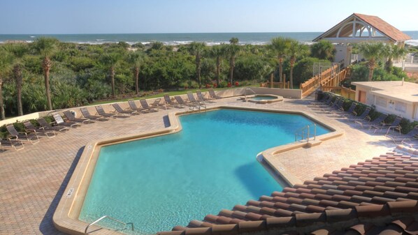 Through the balcony gate and down a short staircase, you'll find yourself poolside. The pool is heated in the winter and accompanied by a hot tub, outdoor kitchen with two gas grills, a gazebo, and a walkway that leads straight to the sand.