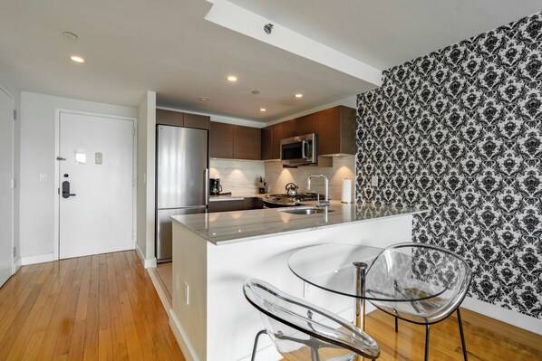 This apartment is professionally managed by Furnished Quarters, the largest independently owned and operated supplier of short-term furnished housing with over 25 years of experience in the industry. The luxury building features amenities like a 24-hour attended lobby, resident lounge, laundry room, rooftop terrace with Hudson River views and fitness center with city views. The upper Chelsea location is convenient and centralized, just steps from Madison Square Garden and Penn Station. This ultra-stylish, uniquely designed one-bedroom apartment in a luxury Chelsea building features hardwood floors, large windows letting in copious natural light and great city views, an open kitchen, generous closet space and high-end finishes and appliances. The bed provided is queen size, fitted with plush linen sheets and pillows. All Furnished Quarters apartments include 24/7 guest service.