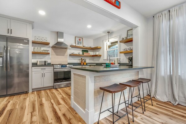 Inside, the open concept floorplan creates a spacious yet connected vibe. The fully applianced kitchen has ample storage and all the comforts of home. The large living room is centered around a 75” smart television w/soundbar and woodstove. There is a Sonos smart speaker, extra-long couch (with pull-out bed), and an oversized armchair perfect for relaxing after a long day on the slopes. Play board games gathered around the coffee table, enjoy your beverage of choice while watching the fire, wrap yourself in a cozy blanket and just RELAX!