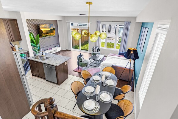✔ Seats 6 people + 2 people bar table in the kitchen