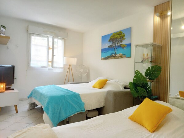 Studio with direct access to the sea. Very quiet street. Cool apartment: facing north west. A quality sofa bed with (190*140 cm sofa) + 1 90*190 foldable bed