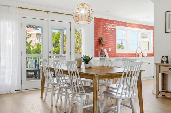 Whether you're preparing a seafood dinner or enjoying takeout after a beach day, the layout keeps everyone connected and comfortable.