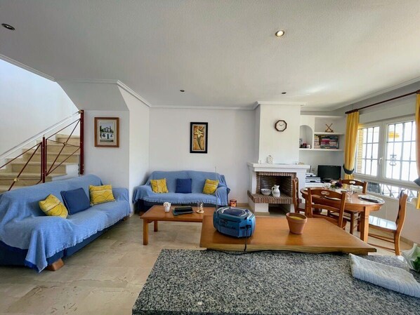 You enter the property from the small front terrace into the open plan Kitchen/living room. The kitchen is American style and equipped with oven, Microwave, Dishwasher, hob etc. There is a lovely 4 person dining table and two sofas with a side board, TV with international channels and coffee table. This property also has a feature fireplace, not working but beautiful with candles.