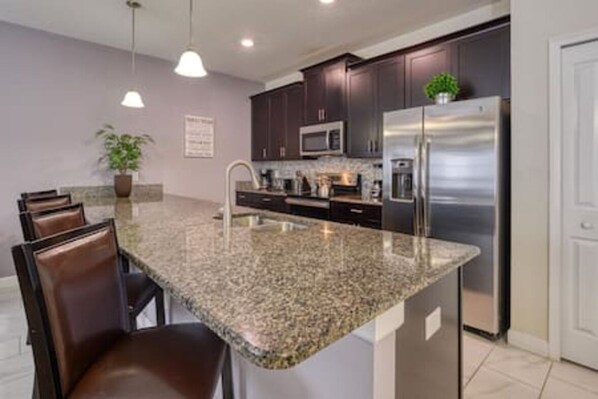 Skip the hassle of dining out and enjoy the convenience of a large, modern kitchen with granite countertops and full-size stainless steel appliances. Stocked with all the essentials, this kitchen makes it easy to prepare home-cooked meals and share them around the dining table.