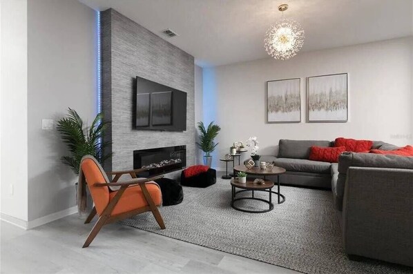 DETAILS • Central AC • Washer & Dryer • Gated Community • TV In Every Bedroom • Free Cable TV & WIFI • Fully Equipped Kitchen • Towels & Linens Provided • Washcloths Are Not Provided • Family Room with Flat Screen TV • Hair Dryers, Iron & Ironing Board • Private Door Code for Each Guest Stay • Outdoor Patio Furniture with Sun Loungers • Pack 'n play/ High Chair (Free Upon Request) • Private Screened-in Pool + Child Safety Pool Fence • PS4