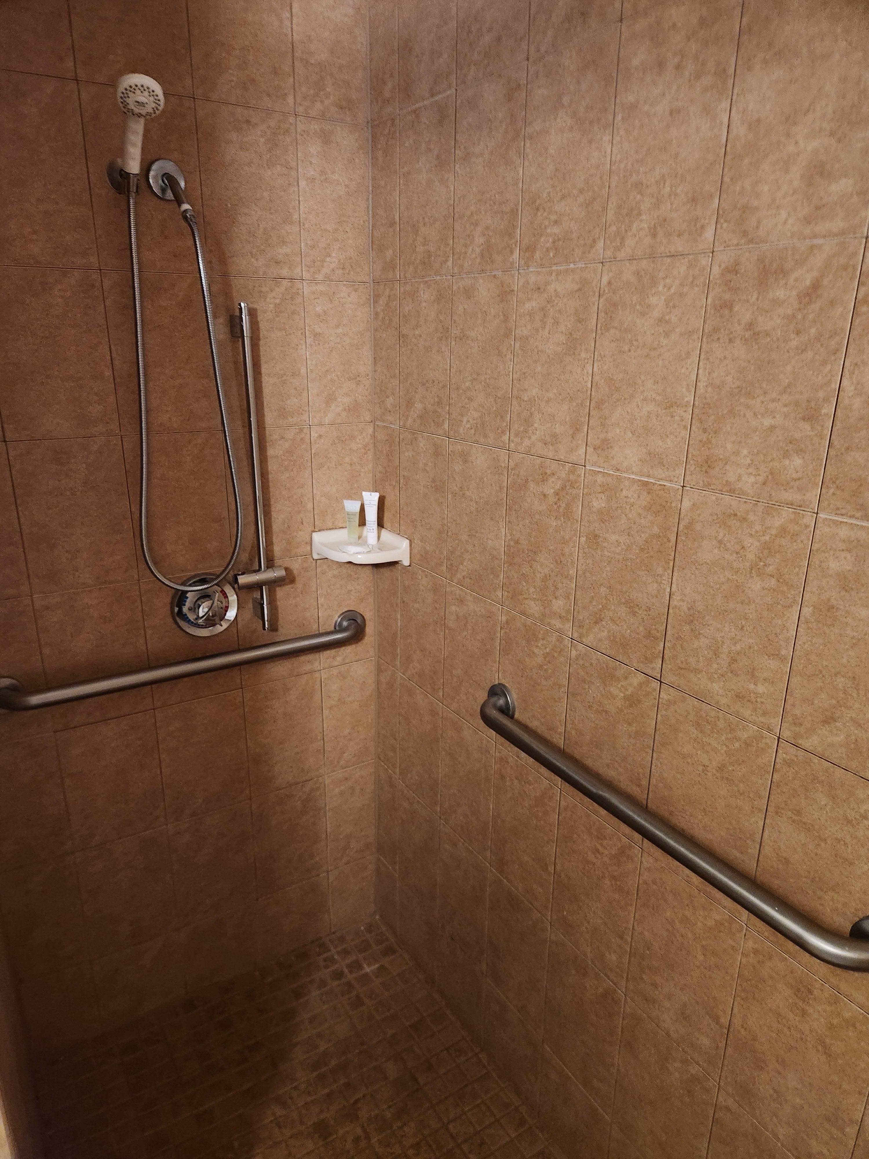 Salle de bains avec ensemble douche/baignoire et articles de toilette gratuits